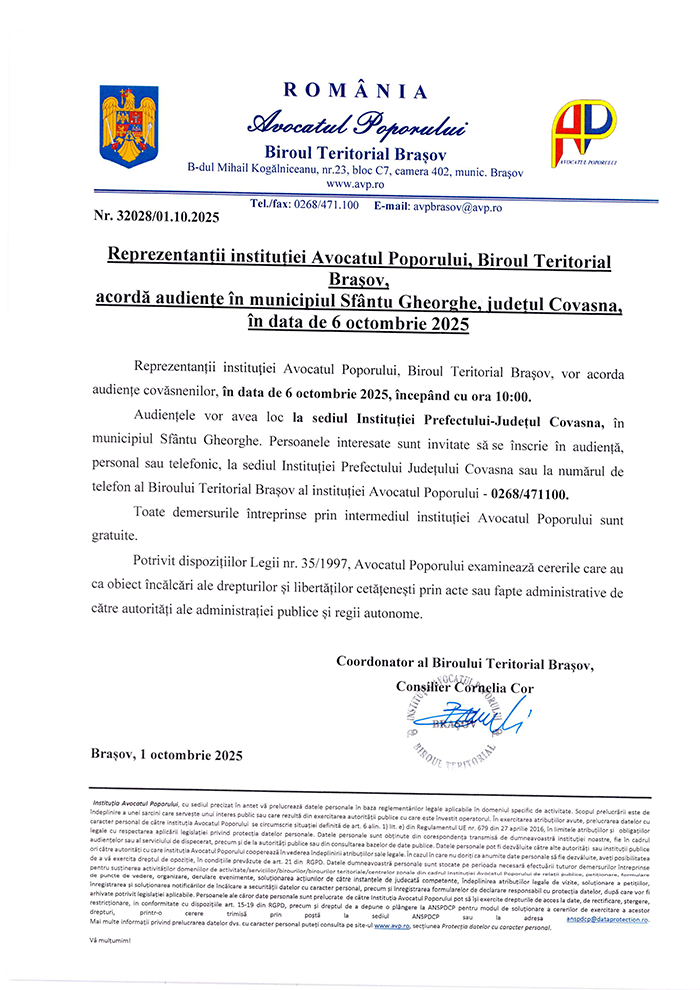 Informare cu privire la suspendarea obligativității de a se prezenta la viza lunară a persoanelor din evidența AJOFM Covasna. Detalii aici >> |
