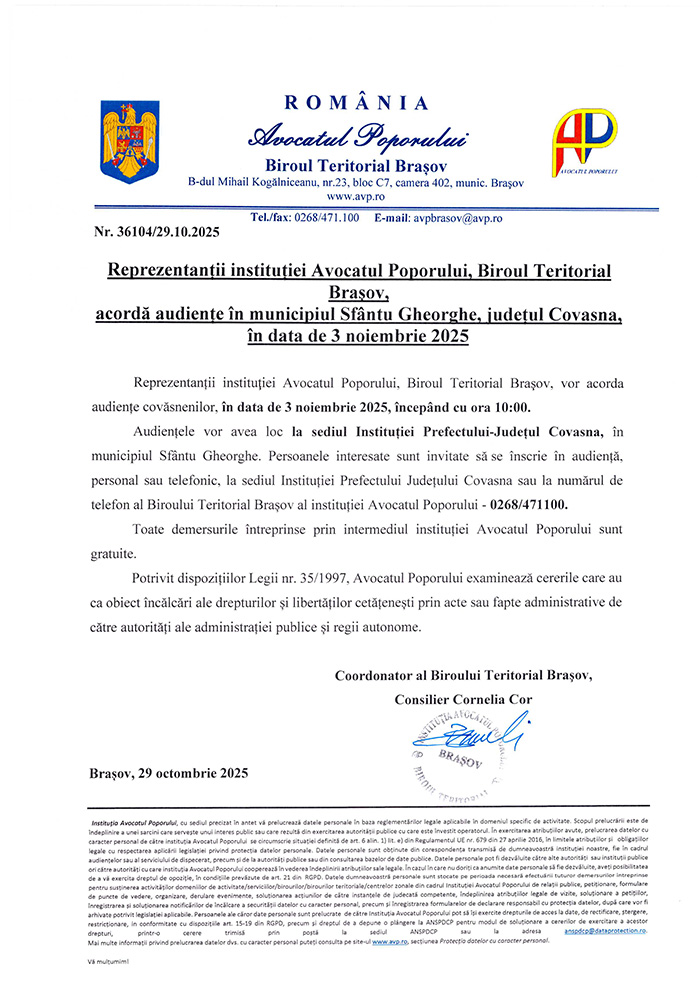 Informare cu privire la suspendarea obligativității de a se prezenta la viza lunară a persoanelor din evidența AJOFM Covasna. Detalii aici >> |